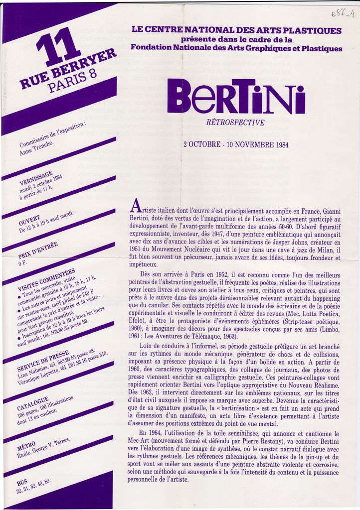 Έντυπο, χαρτί διπλής όψης, 30 x 21 εκ., στα γαλλικά, έκθεσης του Gianni Bertini στο Παρίσι. Δίνονται πληροφορίες για τον καλλιτέχνη και το έργο του. Στο ίδιο αναγγελία επόμενης έκθεσης που θα φιλοξενηθεί στο ίδρυμα, του Pierre Dmitrienko.