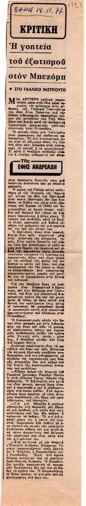Απόκομμα, χαρτί, 41 x 6,5 εκ., στα ελληνικά, δημοσίευσης άρθρου αναφερόμενου στο εικαστικό έργο του Roger Bezombes, με αφορμή έκθεση του καλλιτέχνη στο Γαλλικό Ινστιτούτο Αθηνών. Σχολιάζεται η έκθεση. Στο ίδιο, αναφορά σε εκθέσεις των Ρόμπερτ Πάτελι στην Αίθουσα Τέχνης Αθηνών, ομαδικής στην Galerie Bernier και ομαδικής των Απέργη, Ζουμπουλάκη και Καραβούζη στην Εταιρεία Διάδοσης Σύγχρονης Τέχνης. Εντάσσεται στη στήλη “Κριτική” του εντύπου.