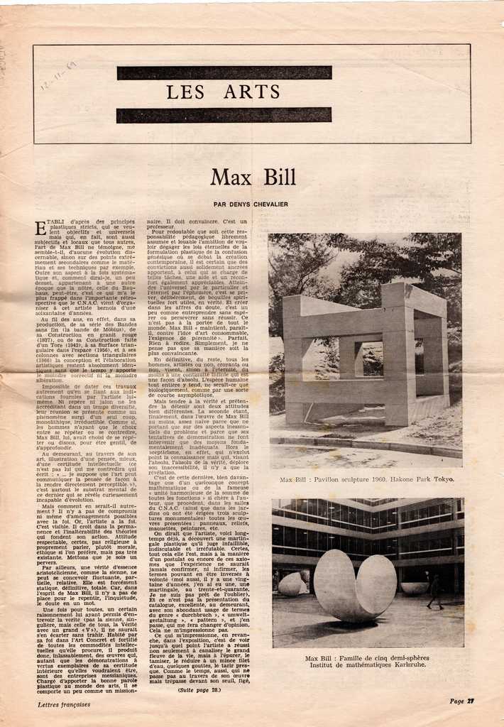 Απόκομμα, χαρτί, 43 x 30 εκ., στα γαλλικά, δημοσίευσης κριτικής έκθεσης του Max Bill στο C.N.A.C στο Παρίσι. Σχολιάζονται τα έργα που παρουσιάζονται.