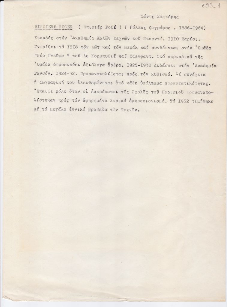 Δακτυλόγραφο βιογραφικό σημείωμα, χαρτί, 29 x 21 εκ., στα ελληνικά, του Roger Bissière, γραμμένο από τον Τώνη Σπητέρη.