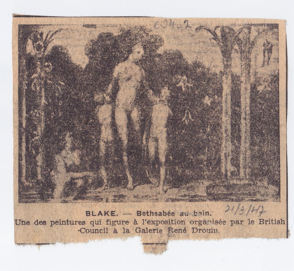 Απόκομμα, χαρτί, 8,5×10 εκ., στα γαλλικά, δημοσίευσης αναπαραγωγής έργου του William Blake, το οποίο παρουσιάζεται σε έκθεση στο Παρίσι.