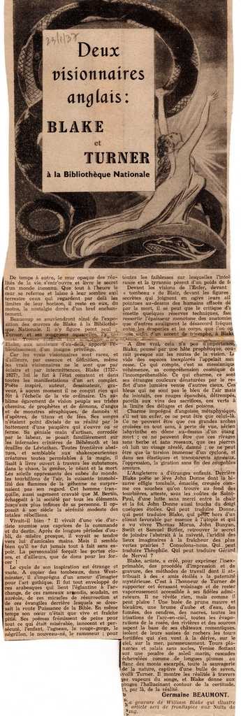 Απόκομμα, χαρτί ακανόνιστου μεγέθους, στα γαλλικά, δημοσίευσης κριτικής ομαδικής έκθεσης ζωγραφικής των Blake και Turner στο Παρίσι.