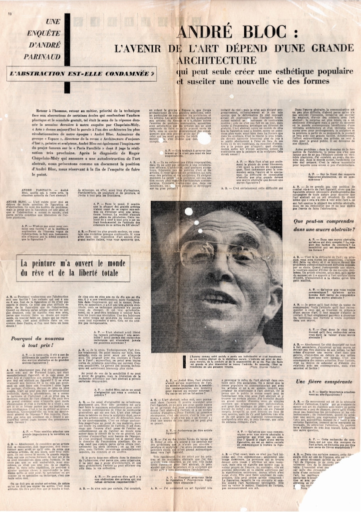 Απόκομμα, έντυπο, χαρτί, 59,5x 43,0 εκ., όπου δημοσιεύεται, στα γαλλικά, συνέντευξη του γλύπτη και αρχιτέκτονα André Bloc στον André Parinaud. Στην άλλη όψη, εκθέσεις της περιόδου.