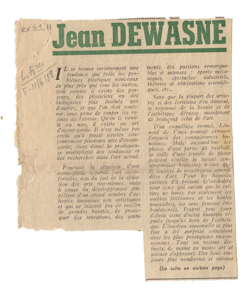 Αποκόμματα έντυπα, χαρτί, 2 τμήματα, 14,0×11,5 εκ. και 39,0×20,5 εκ., όπου δημοσιεύεται, στα γαλλικά, κείμενο του Γάλλου ζωγράφου Jean Dewasne για την τέχνη και το καλλιτεχνικό έργο. Στο πρώτο απόκομμα επιγραφή με τα στοιχεία της δημοσίευσης.
