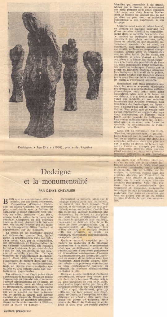 Απόκομμα, έντυπο, χαρτί, όπου δημοσιεύεται, στα γαλλικά, κριτική της ατομικής έκθεσης του Eugene Dodeigne στο Παρίσι το 1971. Στο ίδιο απόκομμα: Raoul-Jean Moulin “Chavignier” και “Dans la lumière de René Char” και “Les signes conducteurs d’Hernandez”.