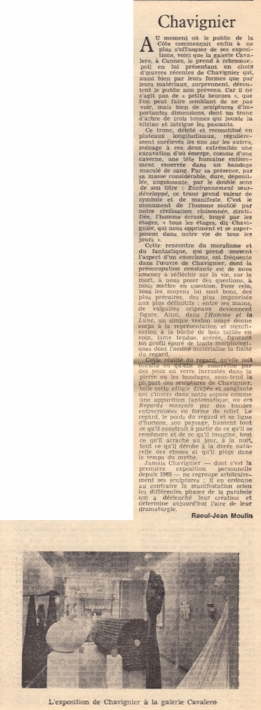 Απόκομμα, έντυπο, χαρτί, όπου δημοσιεύεται, στα γαλλικά, κριτική του Raoul-Jean Moulin για την ατομική έκθεση έργων του Louis Chavignier στο Παρίσι το 1971. Στο ίδιο απόκομμα: Denys Chevalier “Dodeigne et la monumentalité”, Raoul-Jean Moulin “Dans la lumière de René Char” και “Les signes conducteurs d’Hernandez”.