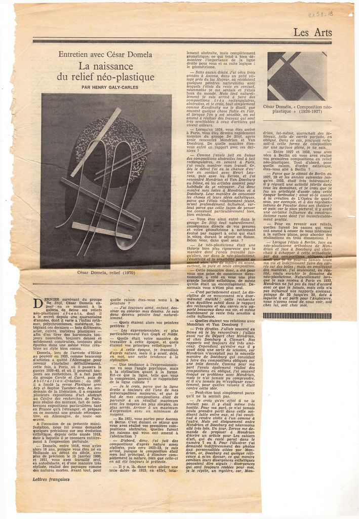 Απόκομμα, έντυπο, χαρτί, 42,8×29,5 εκ., όπου δημοσιεύεται, στα γαλλικά, συνέντευξη του Ολλανδού εικαστικού καλλιτέχνη César Domela στον Henry Galy-Carles με αφορμή την ατομική έκθεση έργων του καλλιτέχνη στο Παρίσι το 1971. Στο ίδιο τεκμήριο: Raoul-Jean Moulin “Les images contradictoires de Lacoste” (απόσπασμα), “Les gravures de Ho Mojong” και σύντομες κριτικές εκθέσεων της περιόδου.