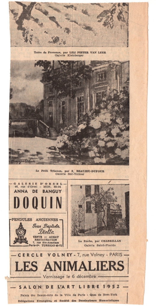 Απόκομμα, έντυπο, χαρτί, 24,0×11,0 εκ., όπου δημοσιεύονται, στα γαλλικά, αναγγελίες εκθέσεων της περιόδου στο Παρίσι. Στην άλλη όψη, συνέντευξη του Louis-Paul Favre με τον Ισπανό σουρεαλιστή ζωγράφο Oscar Domiguez. Επάνω αριστερά, επιγραφή με τα στοιχεία της δημοσίευσης.