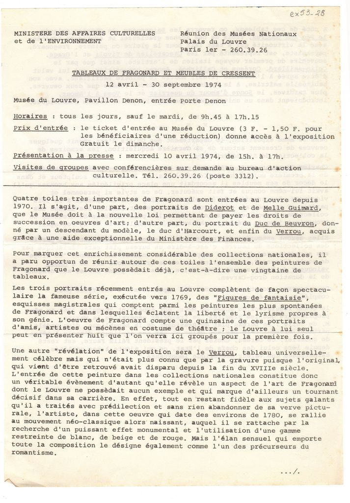 Κείμενο, δακτυλόγραφο, σε χαρτί, δύο όψεις, 29,5×21,0 εκ. Δελτίο τύπου για την θεματικής έκθεσης με πίνακες ζωγραφικής του Jean-Honoré Fragonard και έπιπλα του γλύπτη και επιπλοποιού Charles Cressent που πραγματοποιήθηκε στο Παρίσι το 1974.