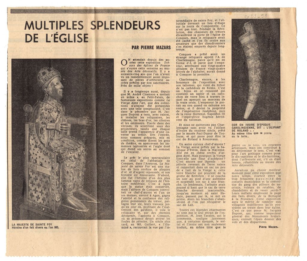 Απόκομμα, έντυπο, χαρτί, 25,7×30,2 εκ., όπου δημοσιεύεται, στα γαλλικά, άρθρο του Pierre Mazars για τη θεματική έκθεση θρησκευτικής τέχνης με κειμήλια από εκκλησίες και μητροπολιτικούς ναούς της Γαλλίας που πραγματοποιήθηκε στο Παρίσι το 1965.