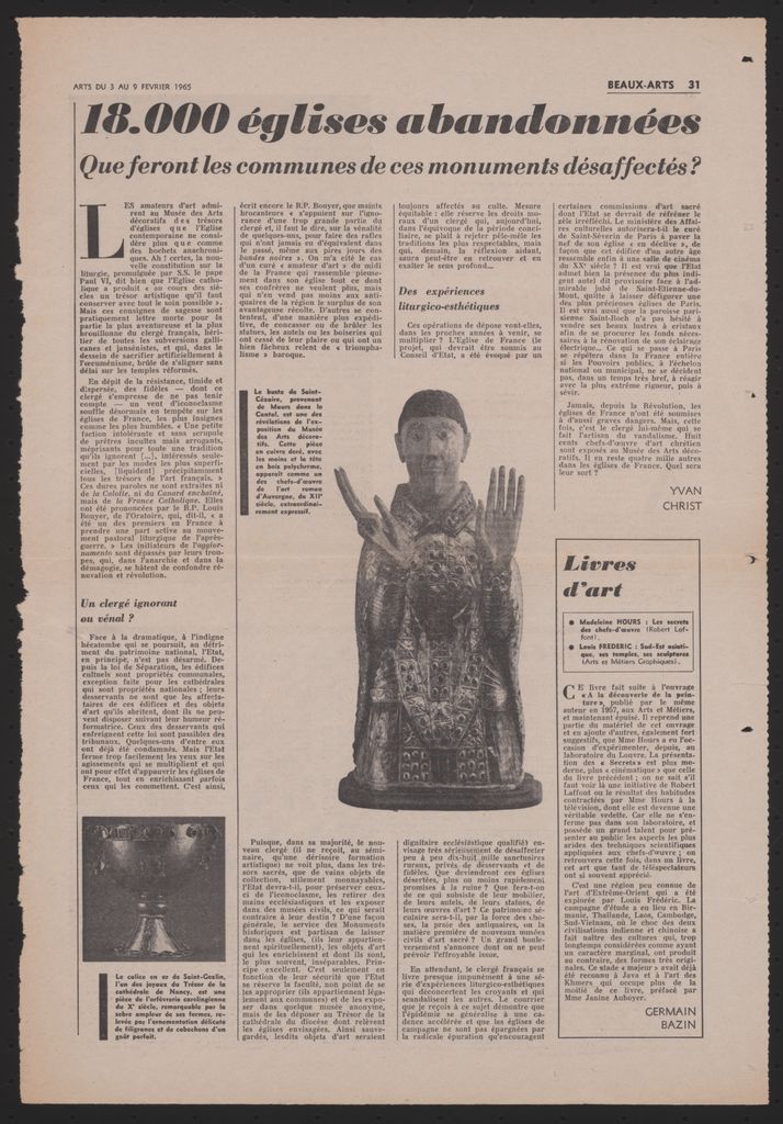 Απόκομμα, έντυπο, χαρτί, 43,0×29,5 εκ., όπου δημοσιεύεται, στα γαλλικά, άρθρο του Yvan Christ για την εγκατάλειψη και την καταστροφή ναών στην Γαλλική επαρχία με αφορμή την έκθεση θρησκευτικής τέχνης που πραγματοποιήθηκε στο Παρίσι το 1965. Στο ίδιο απόκομμα: Raymond Charmet “Au Musée des Arts Décoratifs. 12 siècles 1000 chefs-d’oeuvre”.