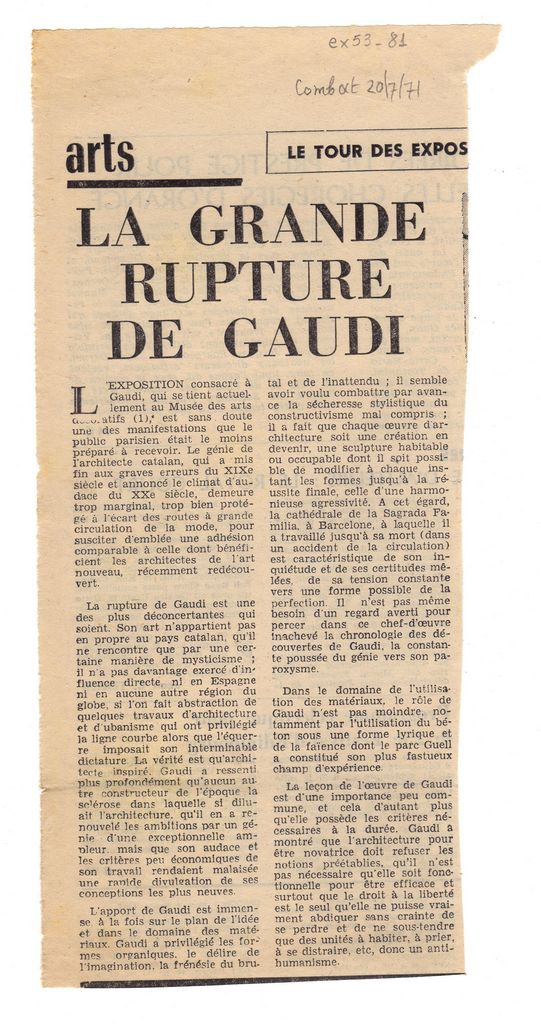 Απόκομμα, έντυπο, χαρτί, 26,0×11,5 εκ., όπου δημοσιεύεται, στα γαλλικά, άρθρο για τη θεματική έκθεση-αφιέρωμα στο έργο του Καταλανού αρχιτέκτονα Antoni Gaudi που παρουσιάστηκε στο Παρίσι το 1971. Επάνω, επιγραφή με τα στοιχεία της δημοσίευσης.