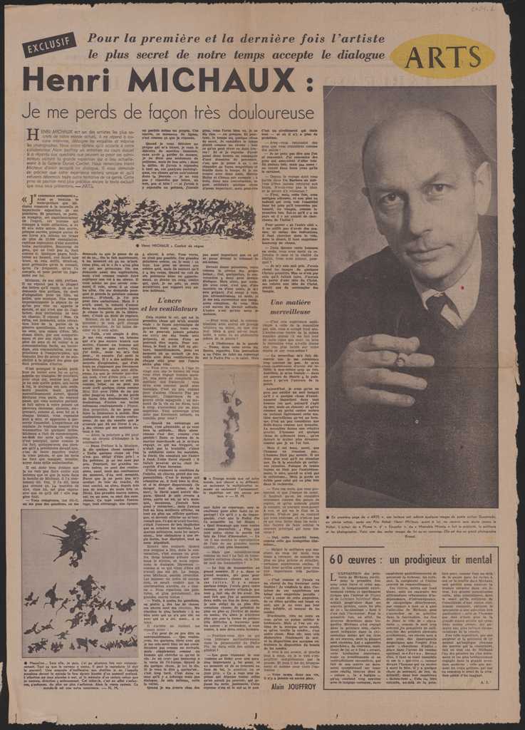 Απόκομμα, χαρτί, 60×42 εκ., στα γαλλικά, δημοσίευσης συνέντευξης του Henri Michaux. Αναφέρεται σε προσωπικά ζητήματα και στο εικαστικό του έργο. Στο ίδιο, “60 oeuvres un prodigieux tir mental”.