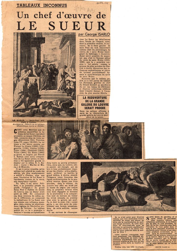 Απόκομμα, χαρτί ακανόνιστου μεγέθους, στα γαλλικά, δημοσίευσης άρθρου αναφερόμενου σε έργο του Georges de la Tour. Αναγράφονται σχόλια για το έργο του “Saint Paul à Ephèse”.