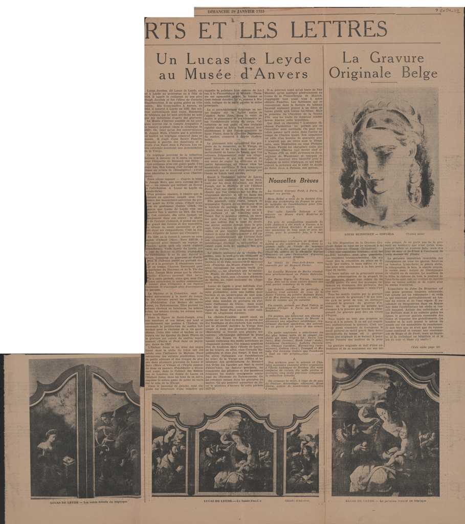 Απόκομμα, χαρτί ακανόνιστου μεγέθους, στα γαλλικά, δημοσίευσης άρθρου το οποίο αναφέρεται σε έργο του Lucas van Leyden που ανήκει στη συλλογή του μουσείου Καλών Τεχνών της Αμβέρσας. Αναγράφονται λεπτομέρειες για το έργο. Στο ίδιο απόκομμα, άρθρα για τη βελγική χαρακτική και άρθρο για τον C. Permeke.