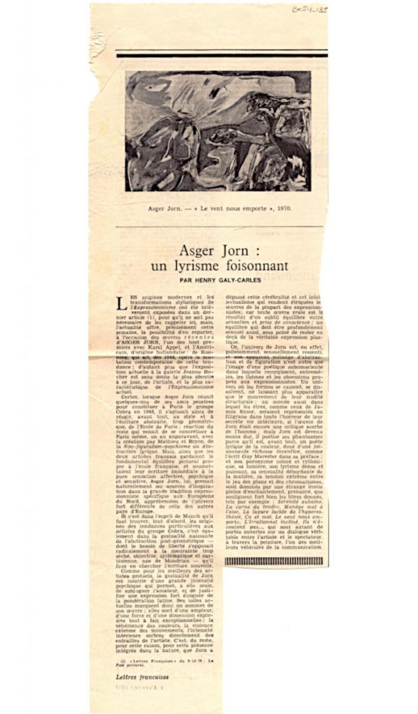Απόκομμα, χαρτί ακανόνιστου μεγέθους, στα γαλλικά, δημοσίευσης άρθρου αφιερωμένου στο εικαστικό έργο του Asger Jorn.