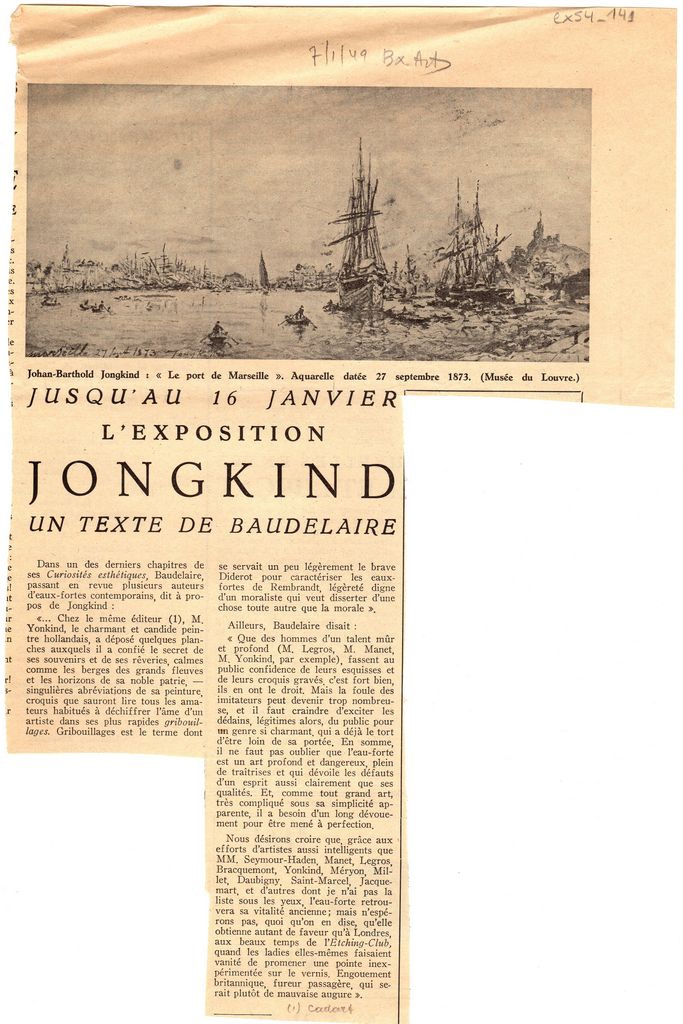 Απόκομμα, χαρτί ακανόνιστου μεγέθους, στα γαλλικά, δημοσίευσης κειμένου του Charles Beaudelaire, στο οποίο αναφέρεται μεταξύ άλλων, στον Johan Jongkind. Δημοσιεύεται με αφορμή αναδρομική έκθεση του καλλιτέχνη, η οποία διεξάγεται στην Orangerie στο Παρίσι.