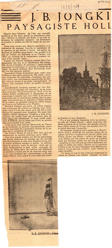 Απόκομμα, χαρτί ακανόνιστου μεγέθους, στα γαλλικά, δημοσίευσης άρθρου το οποίο αναφέρεται στη ζωή και ζωγραφική του Johan Jongkind. Αναγράφονται λεπτομέρειες. Στο ίδιο απόκομμα, άρθρο για τον Δάντη.