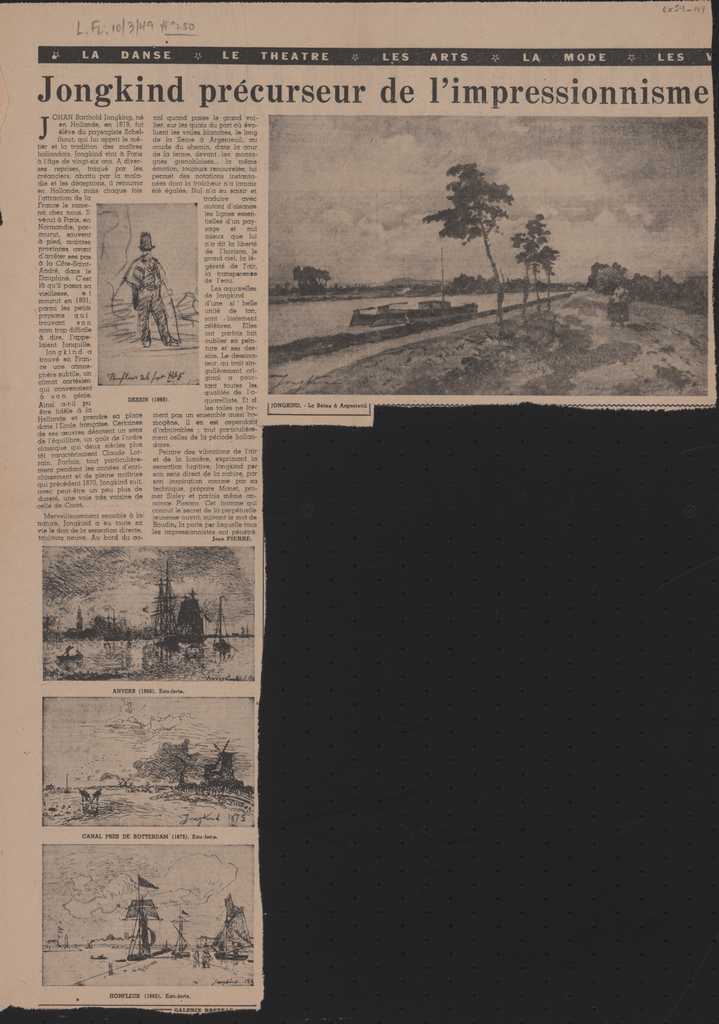 Απόκομμα, χαρτί, στα γαλλικά, δημοσίευσης άρθρου το οποίο αναφέρεται στη ζωγραφική του Johan Jongkind. Σχολιάζεται το εικαστικό του έργο με αφορμή αναδρομική έκθεση η οποία διεξάγεται στην Orangerie στο Παρίσι. Επάνω αριστερά, επιγραφή.