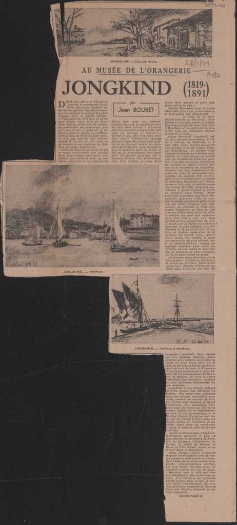 Απόκομμα, χαρτί, 2 φφ, ακανόνιστου μεγέθους και 49×16 εκ., στα γαλλικά, δημοσίευσης κριτικής αναδρομικής έκθεσης Johan Jongkind, η οποία διεξάγεται στην Orangerie στο Παρίσι. Αναγράφονται λεπτομέρειες για τη ζωγραφική του.