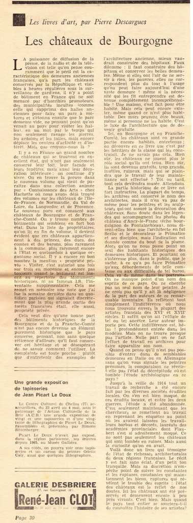 Απόκομμα, χαρτί, 42×30 εκ., στα γαλλικά, δημοσίευσης στήλης του εντύπου με κριτικές κυκλοφορίας βιβλίων της περιόδου. Σχολιάζεται κυκλοφορία βιβλίου αφιερωμένου στα κάστρα της περιοχής Bourgogne της Γαλλίας. Στο ίδιο απόκομμα: “L’ actualité de la sculpture”, “Kowalski”, “Herman Braun et Vélasquez”.