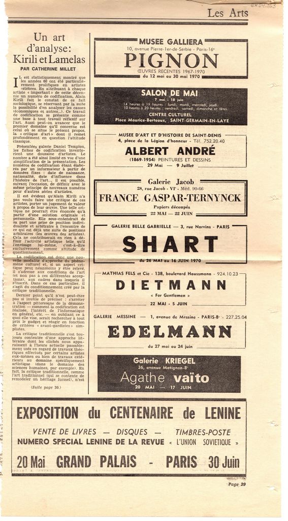 Απόκομμα, χαρτί,43×23 εκ., στα γαλλικά, δημοσίευσης άρθρου το οποίο αναφέρεται στο εικαστικό έργο του Alain Kirili. Στο ίδιο απόκομμα, εκθεσιολόγιο της περιόδου και κριτικές εκθέσεων.