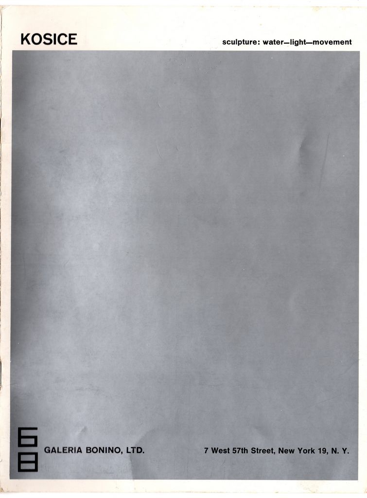 Έντυπο, χαρτί, 5 φφ, 25.5×19.5 εκ., στα αγγλικά, έκθεσης Guyla Kosice, η οποία διεξάγεται στην γκαλερί Bonino στη Νέα Υόρκη. Περιέχει αναπαραγωγές έργων του καλλιτέχνη και φωτογραφιών του, βιογραφικό του σημείωμα με λίστα εκθέσεων.