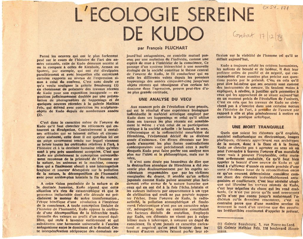 Απόκομμα, χαρτί, 19×24 εκ., στα γαλλικά, δημοσίευσης άρθρου αναφερόμενου στο εικαστικό έργο του Tetsumi Kudo, με αφορμή εκθέσεις έργων του οι οποίες διεξάγονται στο Παρίσι στις γκαλερί Mathias Fels και Beaubourg.
