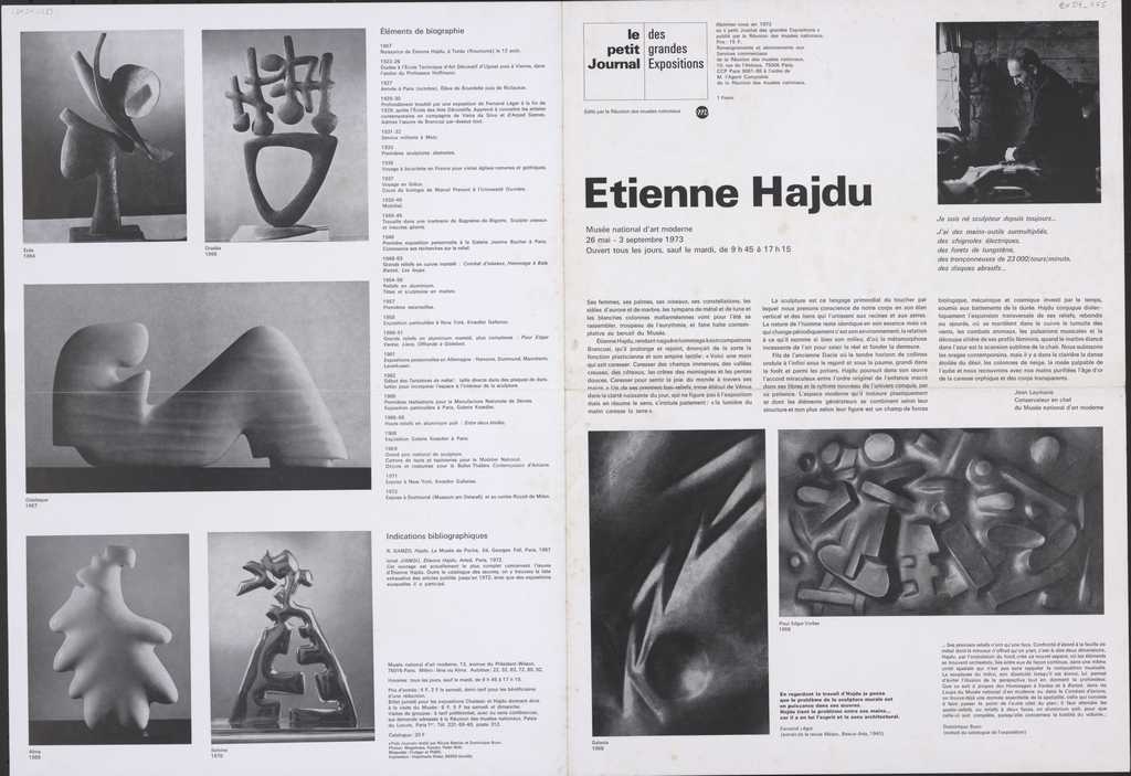 Έντυπο, χαρτί, 2 φφ, 45×32 εκ., στα γαλλικά, αφιερωμένο στην αναδρομική έκθεση του Etienne Hajdu, η οποία διεξάγεται στο Μουσείο Μοντέρνας Τέχνης στο Παρίσι. Αναγράφονται κείμενα για τον καλλιτέχνη και το έργο του και βιογραφικό του σημείωμα.