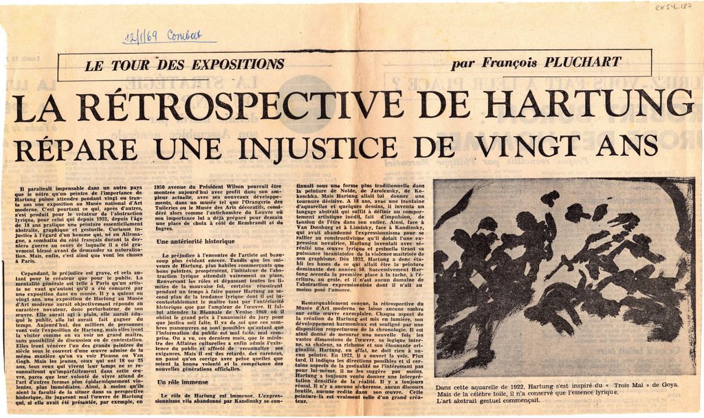 Απόκομμα, χαρτί, 24×42 εκ., στα γαλλικά, δημοσίευσης κριτικής αναδρομικής έκθεσης Hans Hartung, η οποία διεξάγεται στο Μουσείο Μοντέρνας Τέχνης στο Παρίσι. Σχολιάζεται το εικαστικό του έργο.