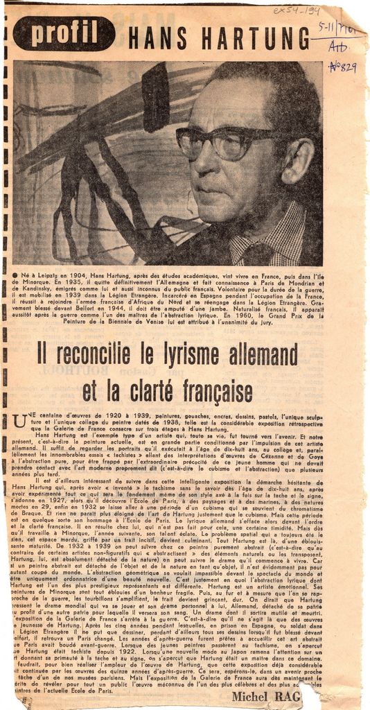 Απόκομμα, χαρτί, 31×16.5 εκ., στα γαλλικά, δημοσίευσης κριτικής αναδρομικής έκθεσης Hans Hartung, η οποία διεξάγεται στην Galerie de France στο Παρίσι. Σχολιάζονται έργα του καλλιτέχνη που παρουσιάζονται σε αυτή και δίνεται βιογραφικό του σημείωμα.