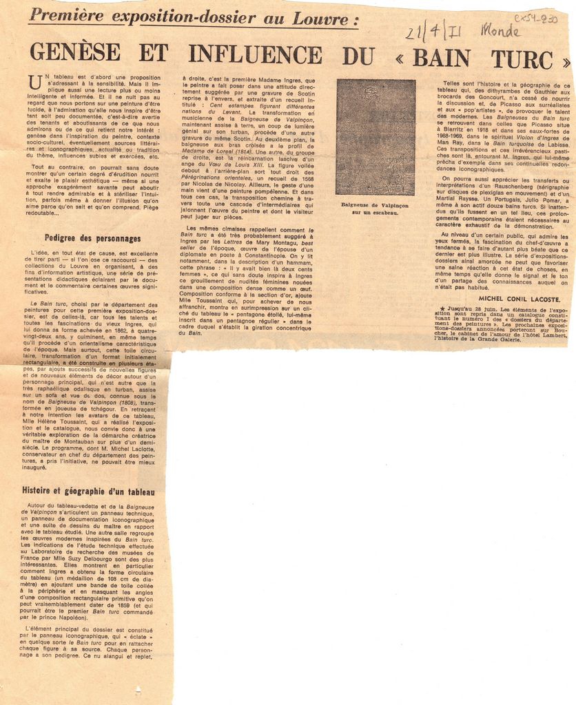 Απόκομμα, χαρτί ακανόνιστου μεγέθους, στα γαλλικά, δημοσίευσης κριτικής έκθεσης του J. D. A. Ingres στο Λούβρο στο Παρίσι. Αναγράφονται σχόλια για το έργο του καλλιτέχνη “Le bain turc”.