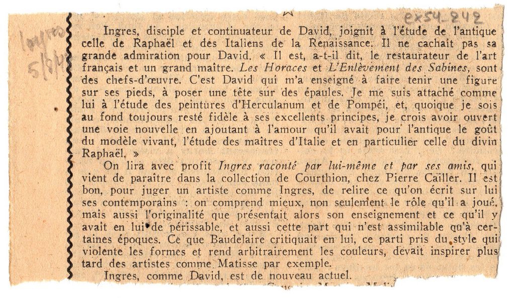 Απόκομμα, χαρτί, 7×12 εκ., στα γαλλικά, δημοσίευσης άρθρου το οποίο αναφέρεται στη ζωγραφική του J. A. D. Ingres. Σχολιάζεται κυκλοφορία βιβλίου στο οποίο μεταφέρονται κρίσεις για τον καλλιτέχνη από τον ίδιο και φίλους του. Κυκλοφορεί από τις εκδόσεις Pierre Cailler.