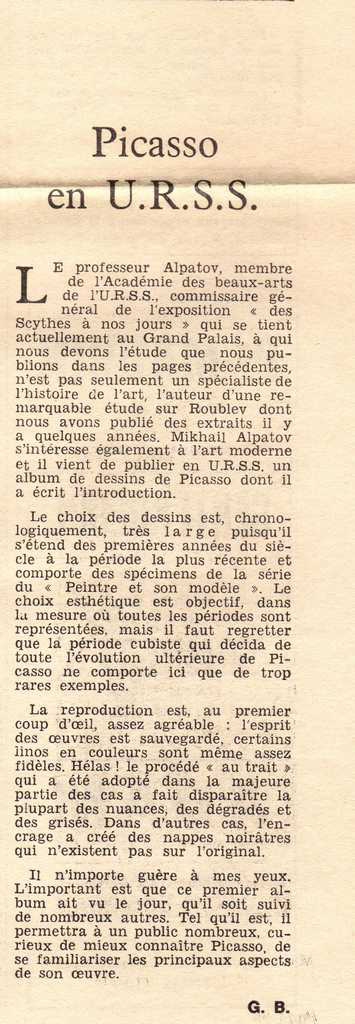 Απόκομμα, χαρτί, 15×30 εκ., στα γαλλικά, δημοσίευσης άρθρου το οποίο αναφέρεται σε κυκλοφορία άλμπουμ σχεδίων του Pablo Picasso τον πρόλογο του οποίου επιμελήθηκε ο Mikhail Alpatov. Αναγράφονται λεπτομέρειες για το περιεχόμενο του άλμπουμ και την επιλογή των έργων που παρουσιάζονται σε αυτό.
