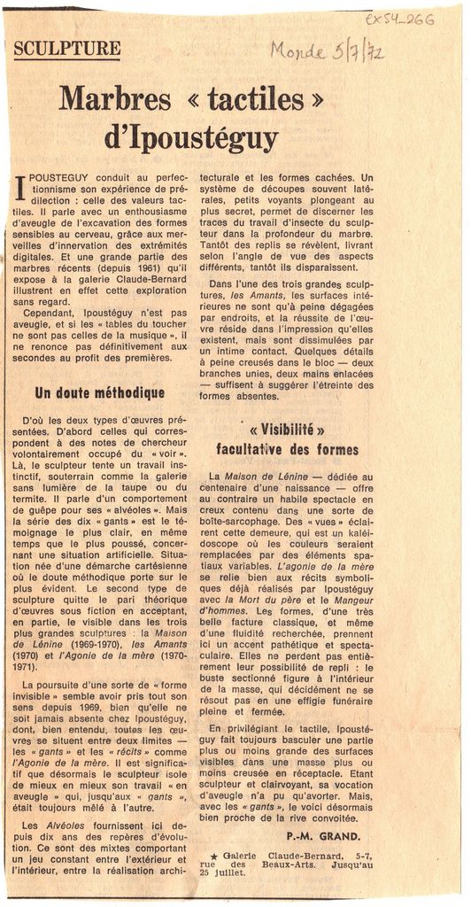 Απόκομμα, χαρτί, 23×12 εκ., στα γαλλικά, δημοσίευσης κριτικής έκθεσης Jean-Robert Ipousteguy, η οποία διεξάγεται στην γκαλερί Claude Bernard στο Παρίσι.