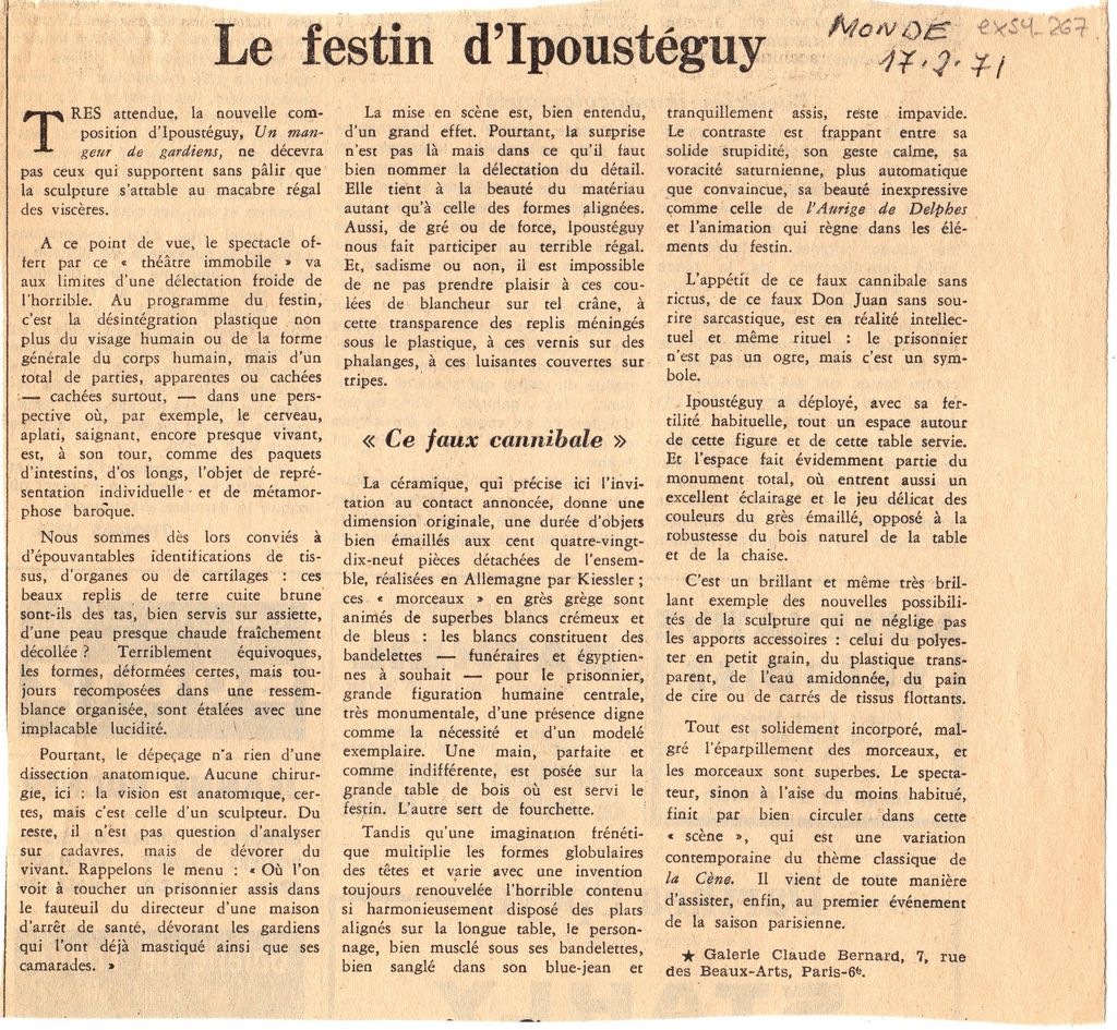 Απόκομμα, χαρτί, 16×17 εκ., στα γαλλικά, δημοσίευσης κριτικής έκθεσης Jean Robert Ipousteguy, η οποία διεξάγεται στην γκαλερί Claude Bernard στο Παρίσι. Σχολιάζονται έργα του καλλιτέχνη.