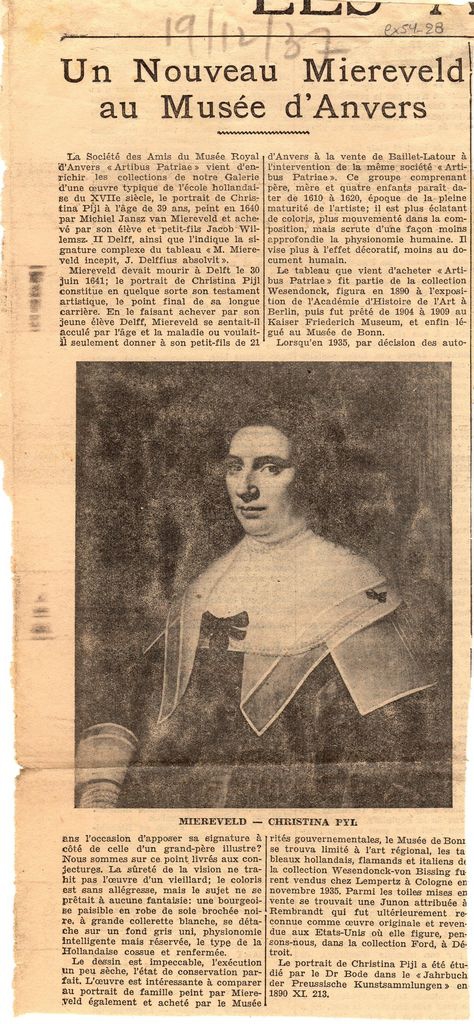 Απόκομμα, χαρτί, 29.5×13 εκ., στα γαλλικά, δημοσίευσης άρθρου το οποίο αναφέρεται στην πρόσκτηση πορτρετου της Christina Pijl, φιλοτεχνημένο από τον M. Mierevelt, στη συλλογή έργων τέχνης του Musée Royal της Αμβέρσας. Αναγράφονται λεπτομέρειες για το έργο.