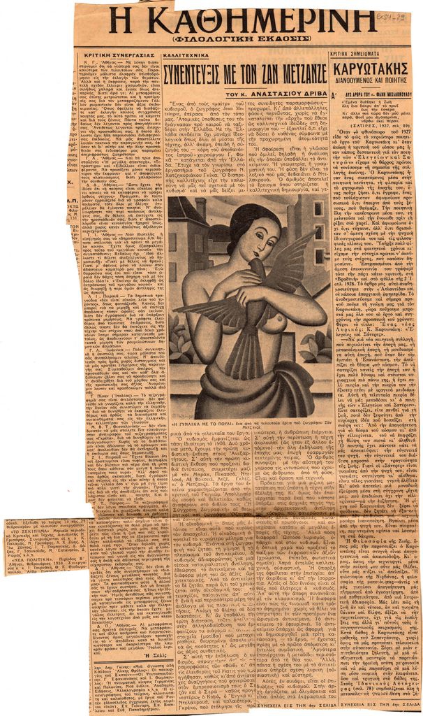 Απόκομμα, χαρτί διπλής όψης, 42×20 εκ., στα ελληνικά, δημοσίευσης συνέντευξης του Jean Metzinger, στην οποία αναφέρεται στον κυβισμό.