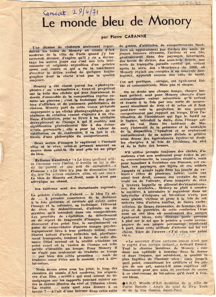 Απόκομμα, χαρτί, 24×17.5 εκ., στα γαλλικά, δημοσίευσης κριτικής αναδρομικής έκθεσης ζωγραφικής του Jacques Monory, η οποία διεξάγεται στο μουσείο μοντέρνας τέχνης της πόλης του Παρισιού. Αναγράφονται λεπτομέρειες για την έκθεση και σχολιάζεται το εικαστικό του έργο.