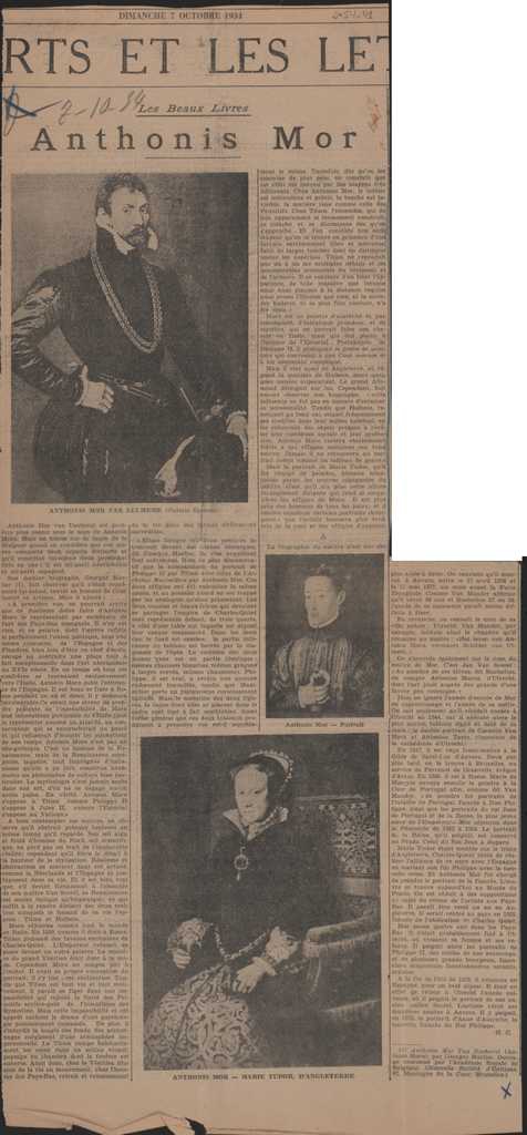 Απόκομμα, χαρτί ακανόνιστου μεγέθους, στα γαλλικά, δημοσίευσης άρθρου το οποίο μεταφέρει απόσπασμα βιβλίου αφιερωμένου στον Antonis Mor, όπου αναγράφονται βιογραφικά του καλλιτέχνη και σχόλια για τη ζωγραφική του.