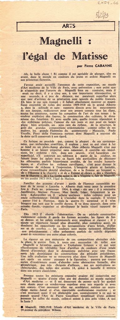 Απόκομμα, χαρτί, 33×12 εκ., στα γαλλικά, δημοσίευσης κριτικής έκθεσης Alberto Magnelli, η οποία διεξάγεται στο Μουσείο Μοντέρνας Τέχνης της πόλης του Παρισιού. Σχολιάζεται η ζωγραφική του καλλιτέχνη.