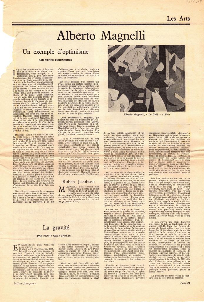 Απόκομμα, χαρτί, 42×30 εκ., στα γαλλικά, δημοσίευσης άρθρου αφιερωμένου στον Alberto Magnelli, με αφορμή τον θάνατο του καλλιτέχνη. Σχολιάζεται το εικαστικό του έργο. Στο ίδιο, δίνεται σύντομο κείμενο του Robert Jacobsen στο οποίο ο καλλιτέχνης αναφέρεται στη σχέση και επιρροή που του άσκησε ο Magnelli.