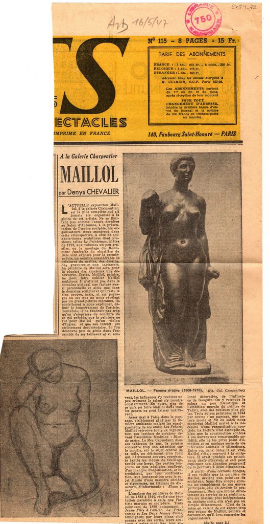Απόκομμα, χαρτί, 2 φφ, ακανόνιστου μεγέθους και 36×5 εκ, στα γαλλικά, δημοσίευσης κριτικης έκθεσης έργων του Aristide Maillol η οποία διεξάγεται στην γκαλερί Charpentier στο Παρίσι. Σχολιάζεται η έκθεση και τα γλυπτά που παρουσιάζονται στην έκθεση.