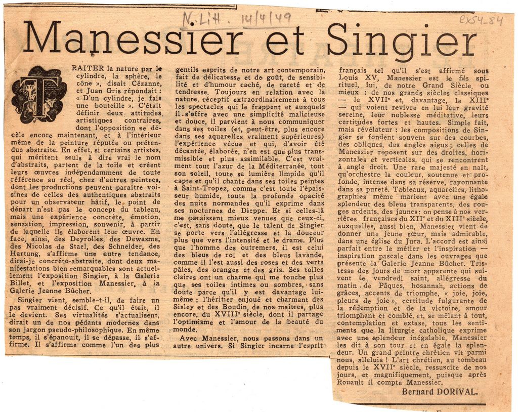 Απόκομμα, χαρτί ακανόνιστου μεγέθους, στα γαλλικά, δημοσίευσης κριτικής εκθέσεων των Alfred Manessier στην γκαλερί Jeanne Bucher και Gustave Singier στην γκαλερί Billet στο Παρίσι. Σχολιάζεται η ζωγραφική τους.