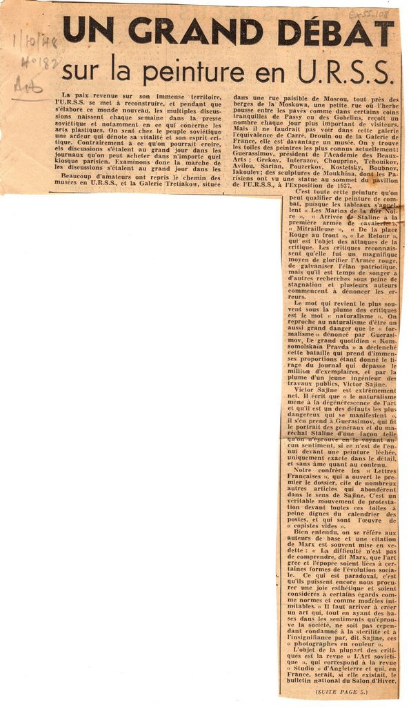 Απόκομμα, χαρτί ακανόνιστου μεγέθους, 2 φφ, στα γαλλικά, δημοσίευσης άρθρου αναφερόμενου στην ζωγραφική της σοβιετικής ένωσης. Σχολιάζεται ο ρόλος της γκαλερί Tretiakow στην Μόσχα, όπου παρουσιάζονται έργα καλλιτεχνών της εποχής καθώς και η στάση της κριτικής απέναντι στο έργο τους.
