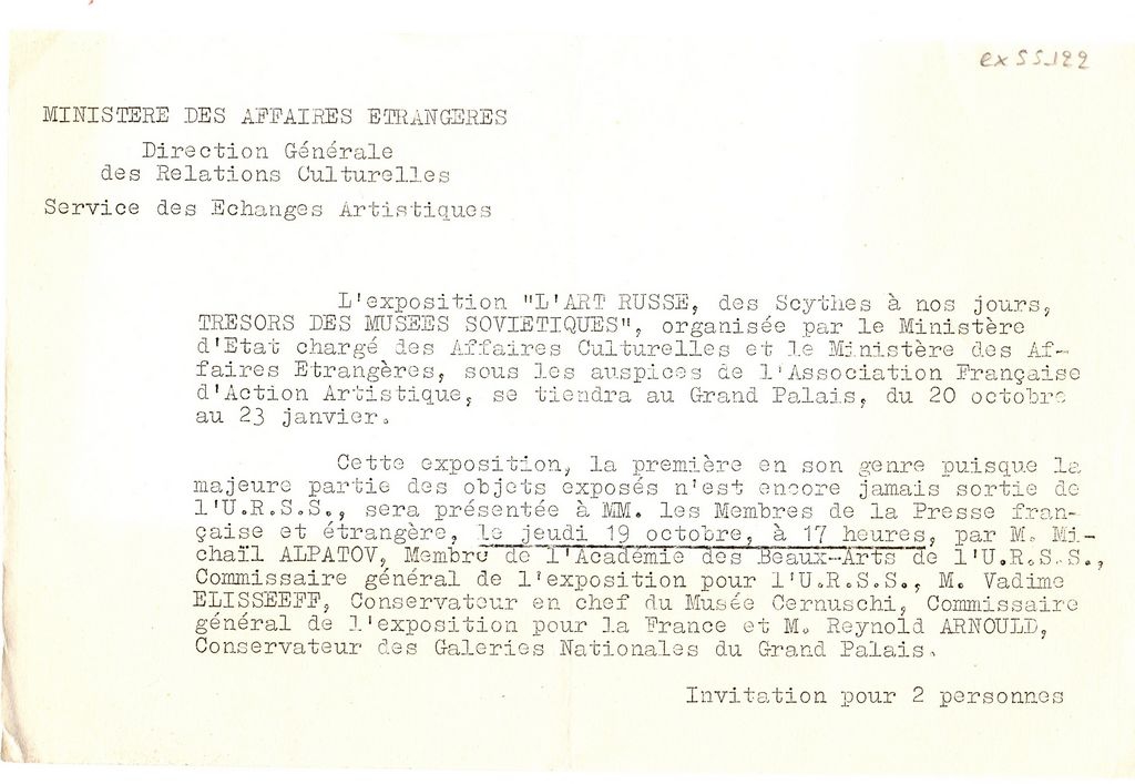Δακτυλόγραφη πρόσκληση, χαρτί, 13.5×21 εκ., στα γαλλικά, για τους εκπροσώπους του Τύπου στην θεματική έκθεση ρωσικής τέχνης, η οποία διεξάγεται στο Grand Palais στο Παρίσι.