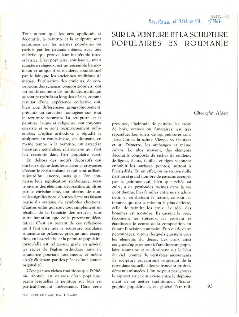 Απόκομμα, χαρτί, 4 φφ, 26×20 εκ., στα γαλλικά, δημοσίευσης άρθρου αναφερόμενου στην λαϊκή ζωγραφική και γλυπτική της Ρουμανίας.