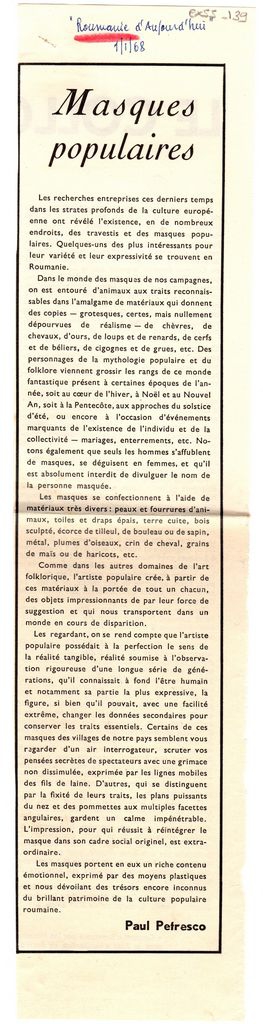 Απόκομμα, χαρτί, 2 φφ, 35×8 & 35×25.5 εκ., στα γαλλικά, δημοσίευσης άρθρου αναφερόμενου σε μάσκες, έργα λαϊκής τέχνης της Ρουμανίας.