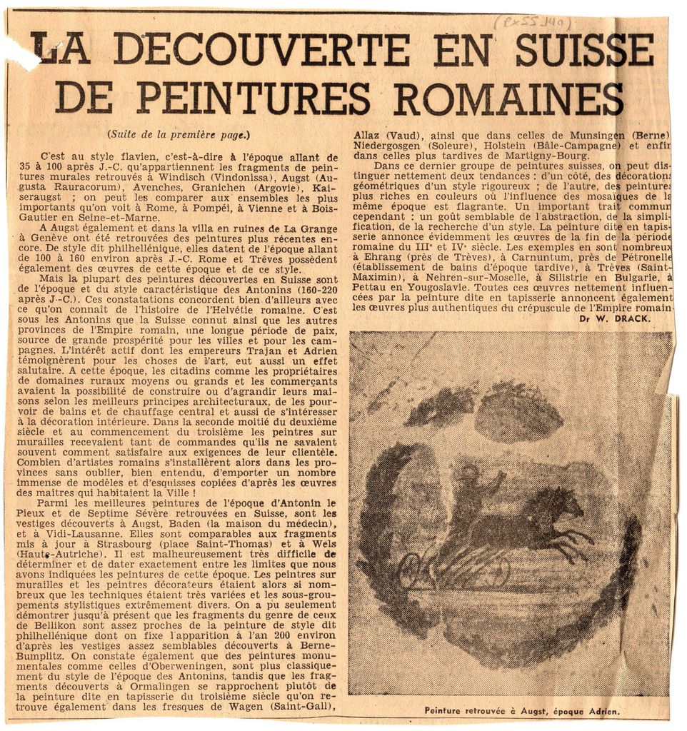 Απόκομμα, χαρτί, 2 φφ, 10.5×12 και 21×20 εκ., στα γαλλικά, δημοσίευσης άρθρου αναφερόμενου σε τοιχογραφίες που βρέθηκαν στην Ελβετία, οι οποίες χρονολογούνται από την ρωμαϊκή εποχή. Αναγράφονται λεπτομέρειες.