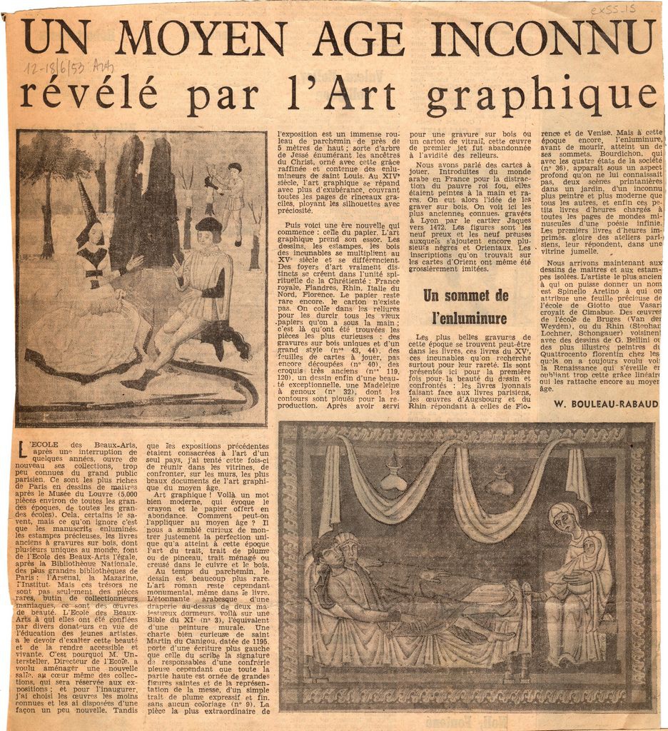 Απόκομμα, χαρτί, 27.5×24 εκ., στα γαλλικά, δημοσίευσης άρθρου το οποίο αναφέρεται στη συλλογή έργων τέχνης της Ecole des Beaux Arts στο Παρίσι. Αναγράφονται λεπτομέρειες για τα έργα γραφικής τέχνης που περιλαμβάνει τα οποία παρουσιάζονται σε έκθεση που διοργανώνεται για το κοινό.
